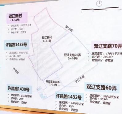 一共有6个住宅小区,包括:双辽新村(1-61号)、双辽支路60弄、双辽支路70弄、许昌路1438号、许昌路1430号和许昌路1432号
