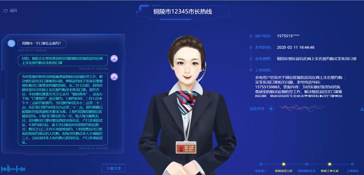 依托铜陵城市超脑平台,助力12345市长热线平台升级,智能客服晓彤7×24小时在线提供咨询、投诉服务,热线日均受理量提升12%,实现70%的咨询类电话自动答复,80%的回访电话自动语音回访,有效缓解客服人员工作压力、节约公共资源。智能助手通过智能提取工单要素,生成工单草稿、并单,辅助客服人员填单、分派事件,进一步提升客服人员工作效率,电话号码查询、工单查询业务人工客服平均受理率分别降低25%和31%。