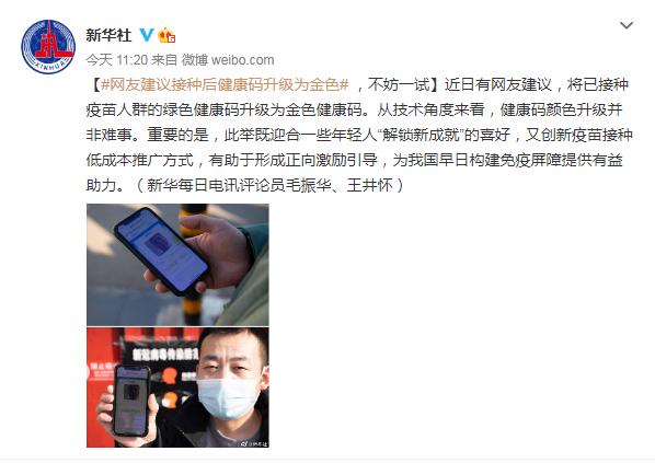 近日,有网友建议将已接种疫苗人群的绿色健康码升级为金色健康码在收获“解锁新成就”的满足感的同时,引导更多人接种新冠疫苗,尽早形成群体免疫。
