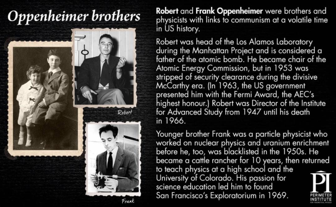 罗伯特的弟弟弗兰克则是主攻核物理和铀浓缩的粒子物理学家,他在20世纪50年代同样受到了麦卡锡主义的迫害。