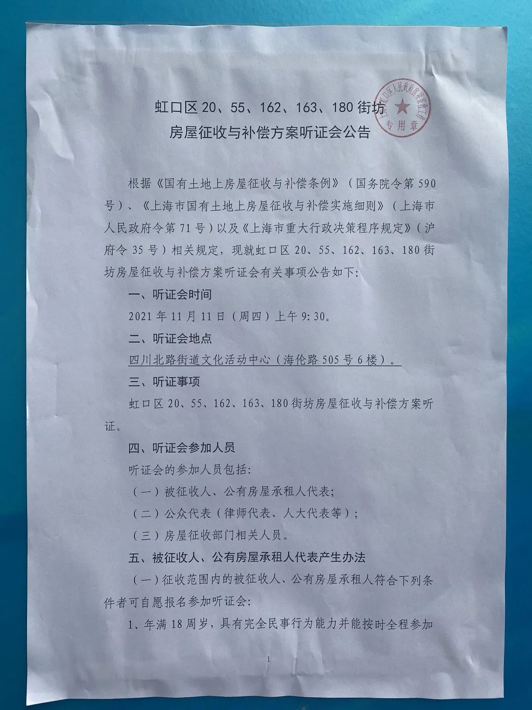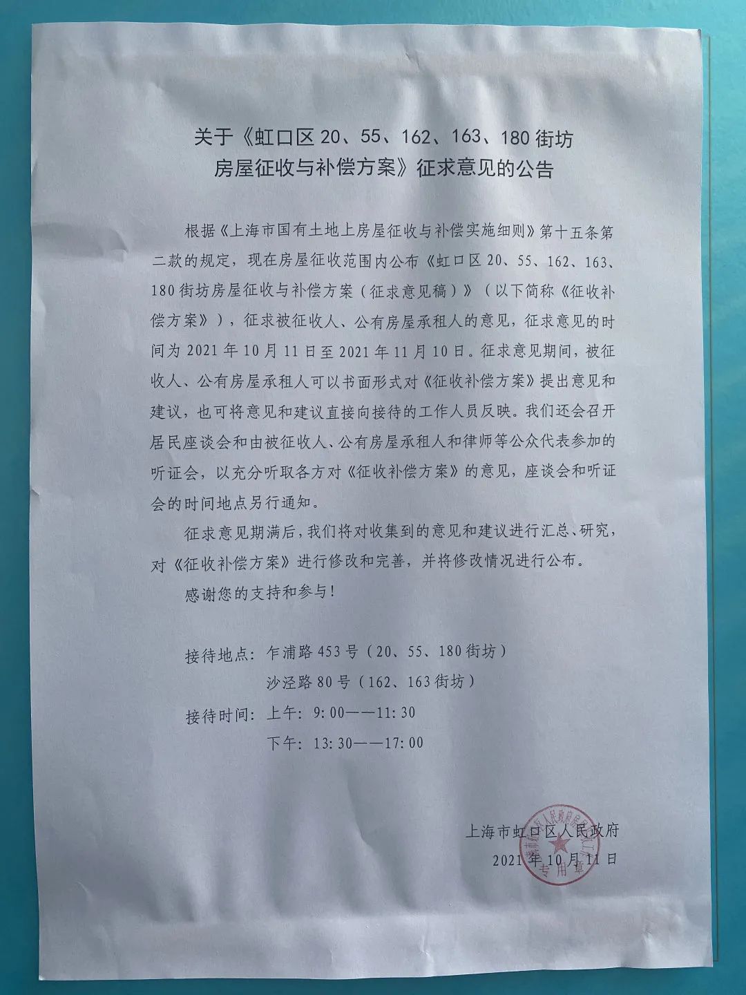 《虹口区20、55、162、163、180街坊房屋征收与补偿方案》(征求意见稿)和《虹口区20、55、162、163、180街坊房屋征收与补偿方案听证会公告》日前已在162、163街坊旧改基地张贴公示啦,居民朋友们可以前往了解公示内容!
