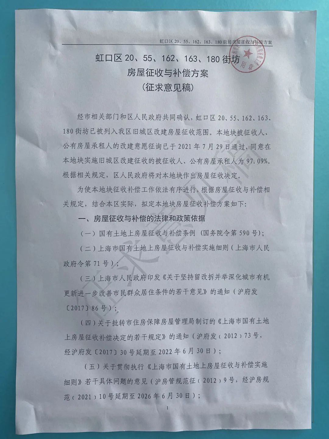 基地经办人员近日将陆续发送《虹口区20、55、162、163、180街坊房屋征收与补偿方案》(征求意见稿)给居民。