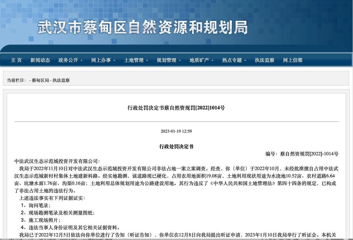 2023年1月19日,武汉市蔡甸区自然资源和规划局发布一份行政处罚决定(蔡自然资规罚[2022]-1014号),指向中法武汉生态示范城投资开发有限公司。