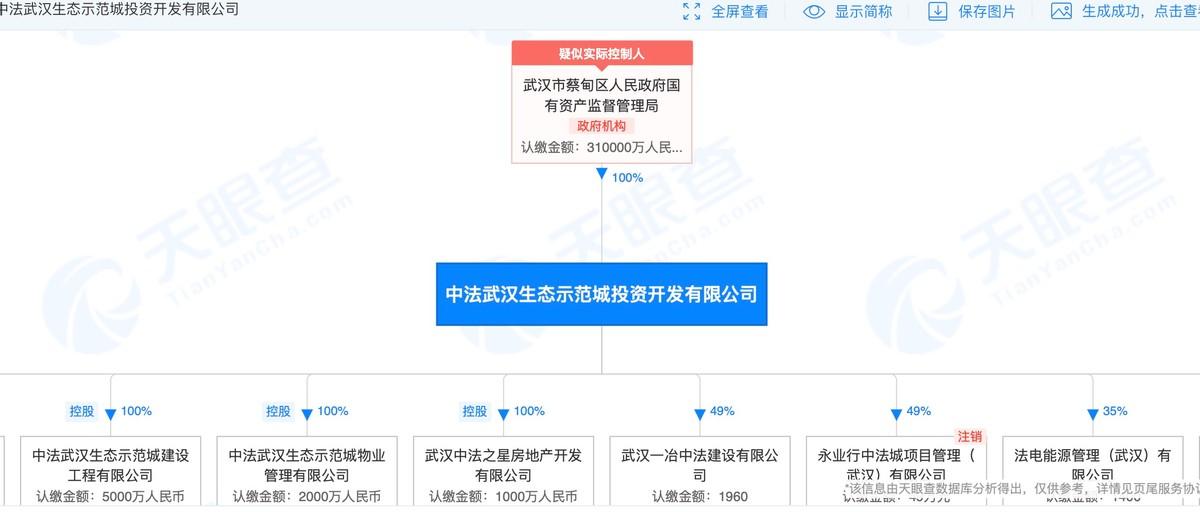 天眼查APP显示,中法武汉生态示范城投资开发有限公司法定代表人为凃辉,中法武汉生态示范城成员,位于湖北省#武汉市,是一家以从事商务服务业为主的企业。股权穿透图显示,武汉市蔡甸区人民政府国有资产监督管理局100%持股中法武汉生态示范城投资开发有限公司。