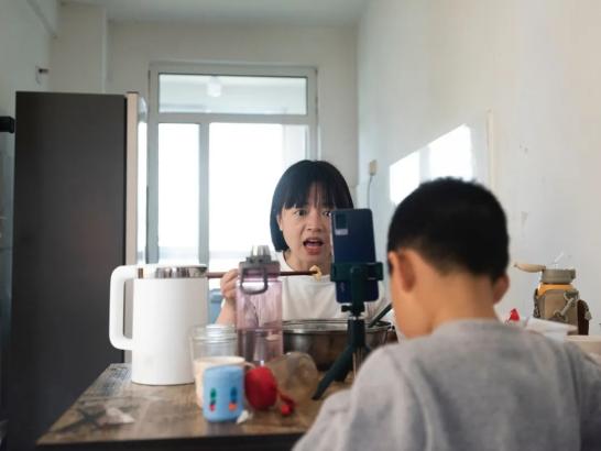 ●临近孩子们放学,李雨菡在家里准备晚饭。