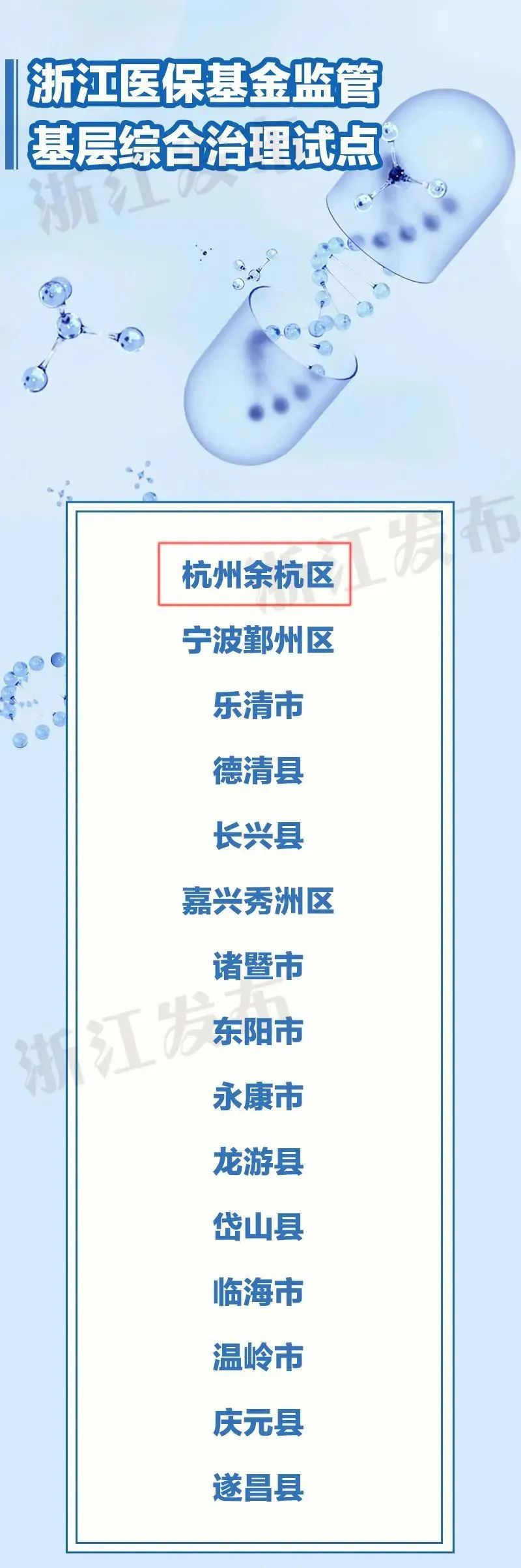 近日,浙江省医疗保障局印发《关于公布医保基金监管基层综合治理试点名单的通知》,确定首批共15个试点县(市、区)名单,余杭区入选!