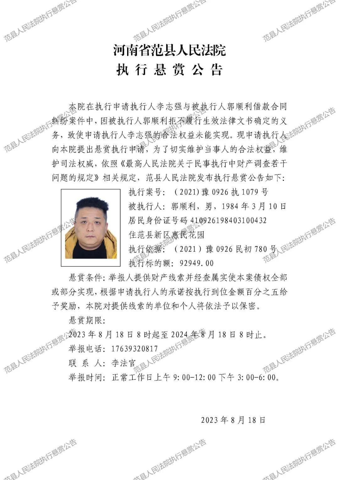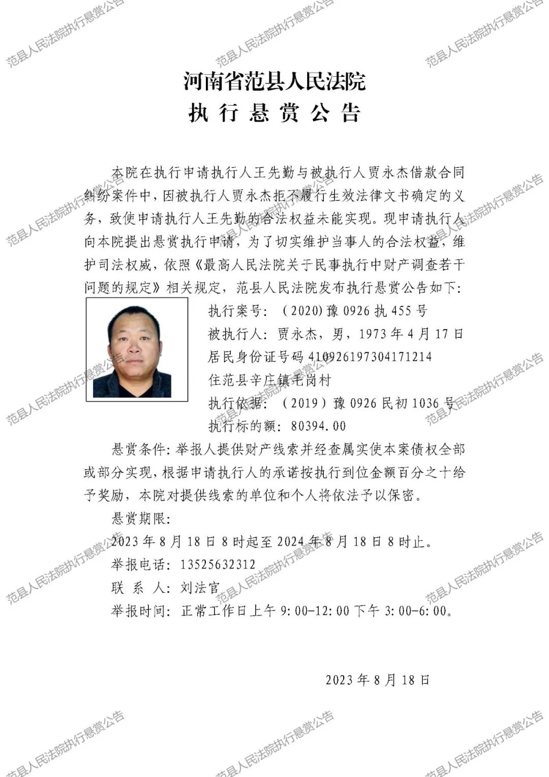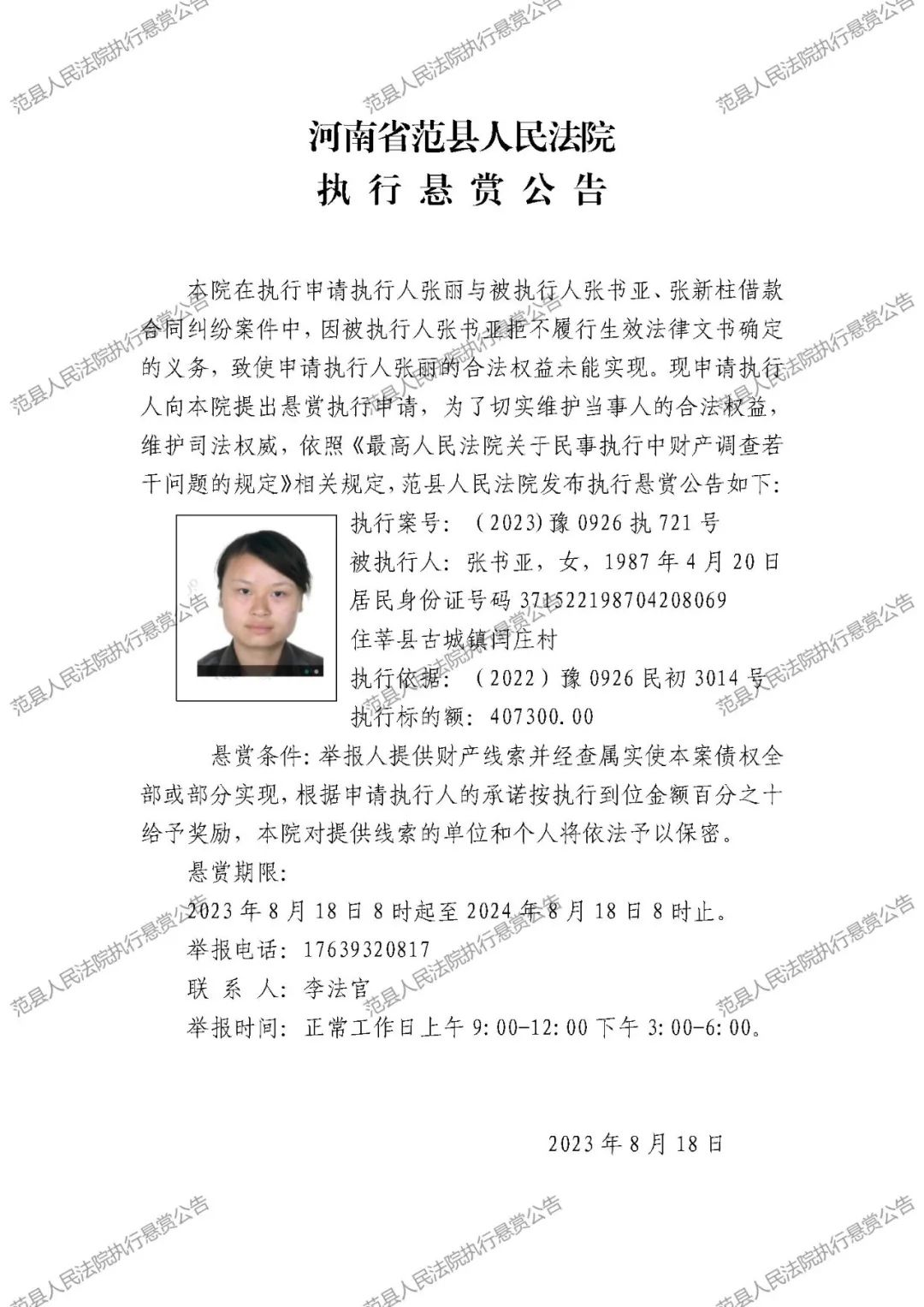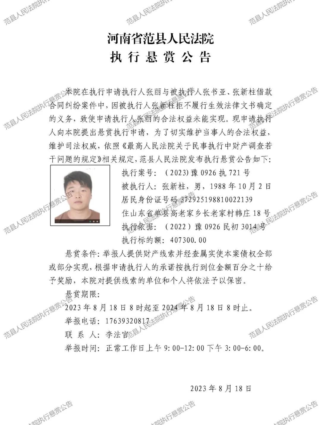 范县人民法院执行悬赏