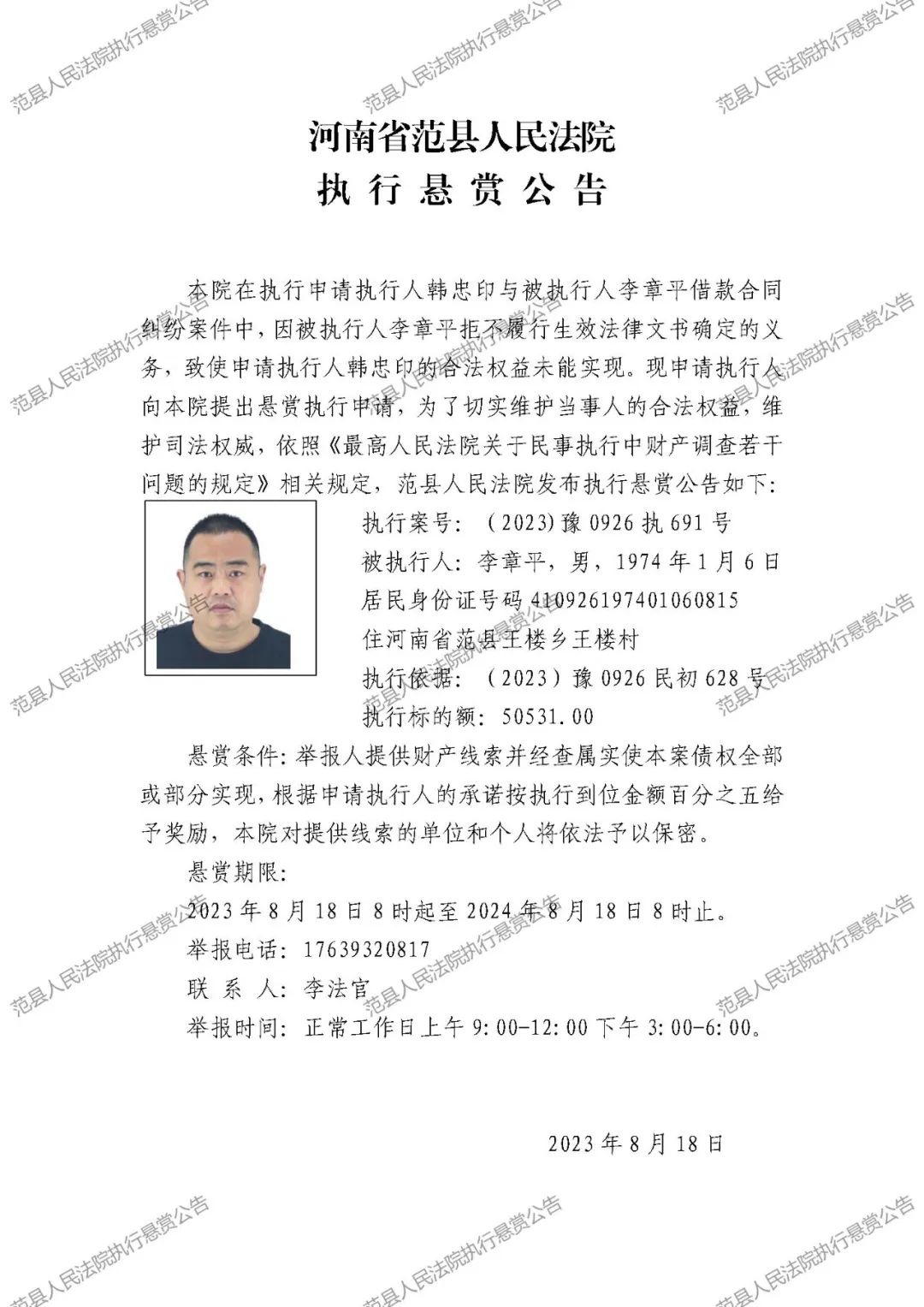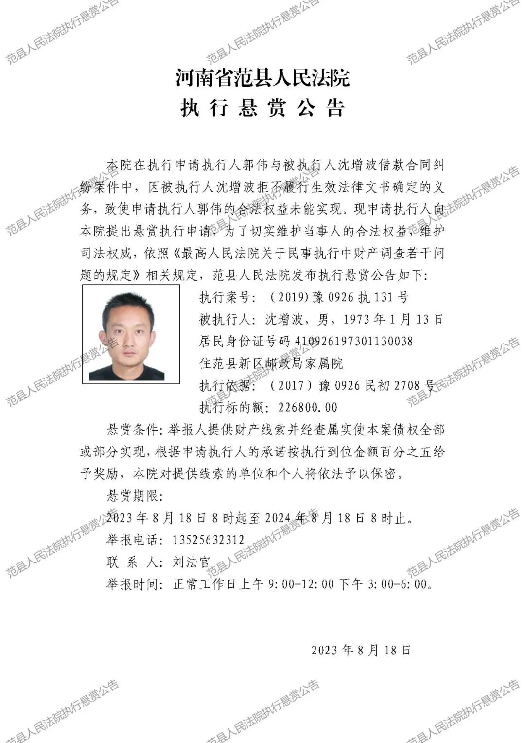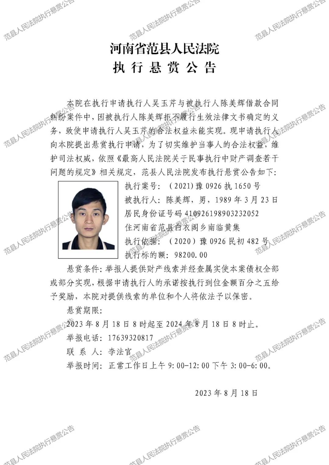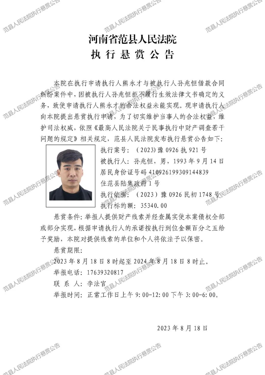 范县人民法院执行悬赏