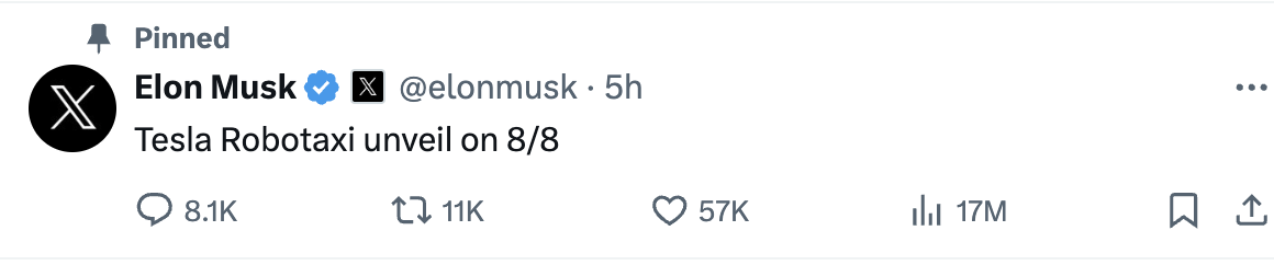 此外值得一提的是,美股收盘后,马斯克还在X上丢出了一记重磅消息,他宣布特斯拉将在8月8日发布Robotaxi。