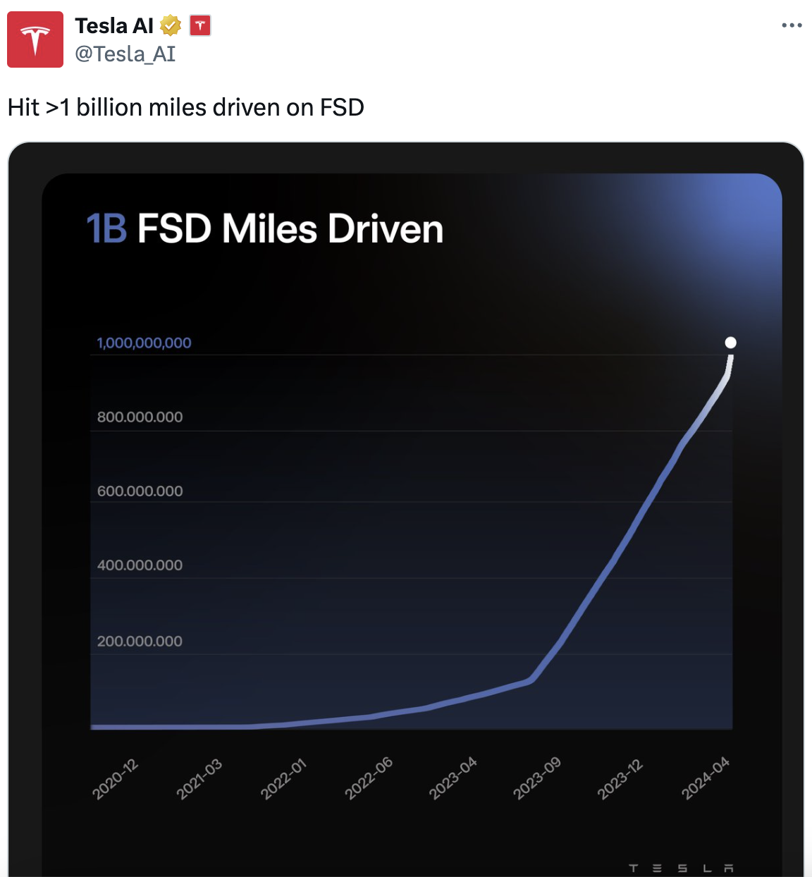 特斯拉还宣布,其FSD的行驶里程已经超过了10亿英里。