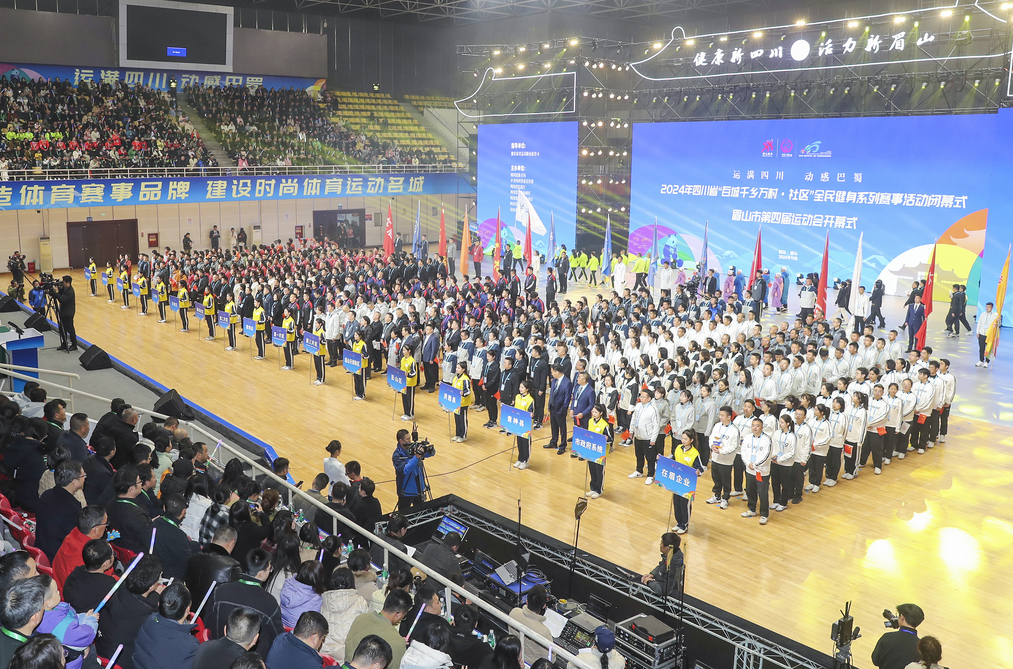 活动分《运满四川·动感巴蜀》《全民健身·万千气象》《全民运动·活力眉山》三个篇章进行,生动展现出全民健身事业在四川这片广袤土地上的蓬勃发展态势。在《运满四川·动感巴蜀》篇章,现场随着音乐旋律的响起,节目健身操《活力百城千乡万村》精彩登场,来自全省四个片区的健身爱好者用热情舞步点燃全场,展现出四川全民健身的火热情景。紧随其后,入场式精彩纷呈,国旗护卫队、裁判员方队、4个片区方队以及眉山市第四届运动会的 13 个方队依次入场,各方队各具特色。有的身着民族服饰,彰显四川多元文化魅力;有的挥舞彩旗,以整齐划一的步伐和激昂的口号声,彰显出运动员们奋勇争先的决心与团结协作的精神风貌。