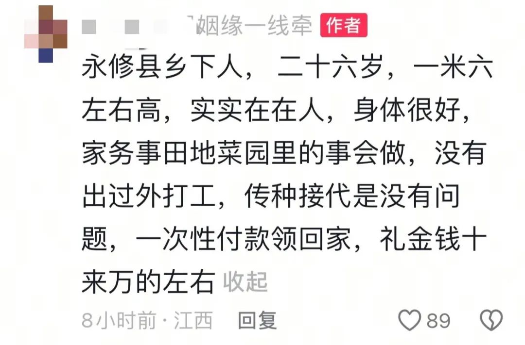 记者注意到,该网民发布了一张女性照片。图片配文提到,“永修县乡下人,二十六岁,一米六左右高,实实在在人,身体很好,家务事田地菜园里的事会做,没有出过外打工,传种接代是没有问题,一次性付款领回家,礼金钱十万元左右。”