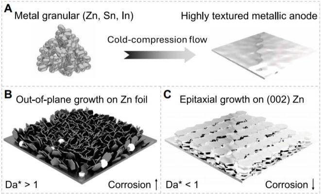 近日,美国康奈尔大学Lynden A. Archer教授等人报道了一种纯机械式的“冷压缩流动”方法,用于制备具有可调晶体织构的锌(Zn)、锡(Sn)和铟(In)基底。以织构化Zn为模型体系,研究了锌的电沉积行为,并展示了晶体薄膜的相关生长,其相关长度从几十到几百微米不等。在电流密度为5 mA/cm2时,根据基底织构程度的不同,容量可达20至82 mAh/cm2。在更高电流(40 mA/cm2)下,容量最高可达604 mAh/cm2。同时,旋转圆盘电极研究表明,以(002)晶面为主的织构化锌基底具有更强的耐腐蚀性,并能减少界面钝化。为此,作者引入了一个有效的达姆科勒数(Da*),以简洁地描述在不同织构基底上电结晶过程中的形貌演化。高织构(002)锌基底在高容量(约20 mAh/cm2)对称锌电池(Zn||Zn)和全电池(Zn||δ-MnO2和 Zn||I2)中显著提升了性能,实现了纽扣电池和软包可充电锌电池的快速充电和持久储能能力。
