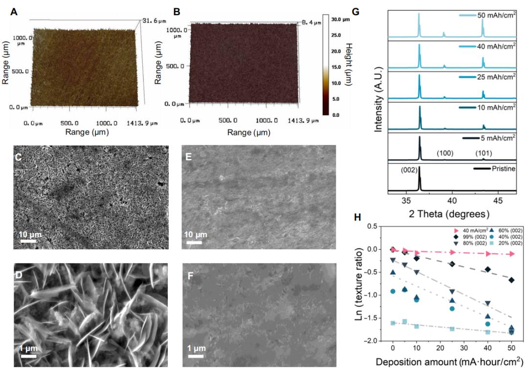 利用激光扫描轮廓仪分析了商业锌箔和通过冷压缩法制备的(002)织构锌电极的表面粗糙度。结果显示,(002)织构锌的表面更光滑,平均粗糙度更低,表面能也更低,且与电解液的润湿性更好。在电沉积实验中,(002)织构锌基底促进了锌的平面致密生长,而商业锌箔则倾向于垂直生长形成枝晶。随着沉积容量的增加,(002)织构的保持能力逐渐下降,但在高电流密度下仍能维持较强的织构性,表明高电流有助于平面沉积。此外,无论初始织构如何,沉积锌的(002)比例在高容量下趋于约20%,接近商业锌粉的水平,说明低织构基底易导致无序沉积和“锌粉化”现象。