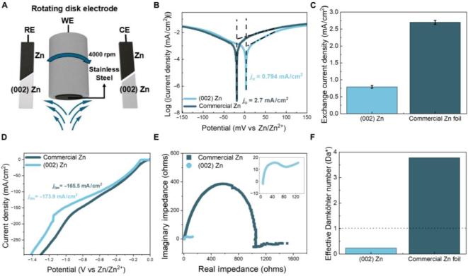 为了解释不同基底上锌沉积形貌差异的根本原因,研究引入了有效达姆科勒数(Da*)来更准确地描述电极表面与电解液之间的离子传输与反应动力学。传统参数无法解释织构锌与商业锌箔在沉积形貌上的显著差异。通过旋转圆盘电极测试发现,(002)织构锌的交换电流密度更低,界面阻抗更小,腐蚀电流更低,表明其更耐腐蚀、界面更稳定。而商业锌箔在电解液中易形成钝化层,导致界面阻抗高、离子传输受阻。引入Da*后,(002)织构锌的Da*约为0.24,远低于商业锌箔的3.78,说明其更有利于均匀沉积。该结果表明,(002)晶面具有更低的表面能和反应活性,有助于抑制副反应和钝化层形成,从而改善沉积形貌和电极可逆性。
