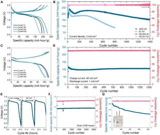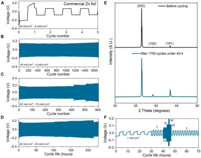 受(002)织构锌电极在锌沉积形貌控制方面显著改善的启发,进一步评估了其在恒流条件下的剥离/沉积性能。在苛刻条件下(40 mA/cm2,4 mAh/cm2),商业锌箔对称电池仅循环一次即失效,而(002)织构锌电极可稳定循环超过1700次,且织构保持良好。在更高面容量(10和20 mAh/cm2)和更高电流密度(80 mA/cm2)下,(002)锌仍表现出优异的循环稳定性和倍率性能。此外,(002)锌在不同电流密度下均展现出更低的成核和平台过电位,且在半电池测试中库仑效率稳定在99.8%以上,而商业锌箔效率波动大、寿命短。即使锌用量更少,(002)锌在20 mA/cm2、20 mAh/cm2条件下仍表现更优,显示出其在实际电池应用中的巨大潜力。