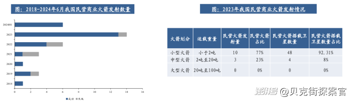 商业航天2.0时代,民营企业商业航天力量不容小觑,公开资料显示,从2018到2024年6月,民营企业累计发射火箭34次,其中27次发射成功,7次发射失败。从总体趋势来看,民营火箭发射数量不断上升,经历了2018到2021年的探索期,发射成功率逐步提升,2022年开始民营火箭发射数量逐步增长,2023年发射14次,与2018-2022年发射总和持平。