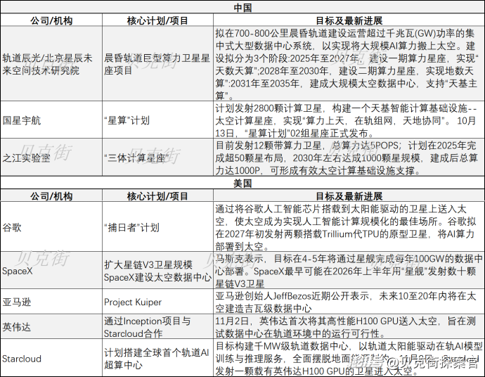除导航通讯类星座计划外,伴随近年来人工智能行业飞速发展,算力需求呈几何倍数增长,多家公司计划将算力送进太空,包括但不限于国内公司/机构“北京星辰未来空间技术研究院”“国星宇航”“之江实验室”;美国谷歌、Space X等熟知的科技公司。