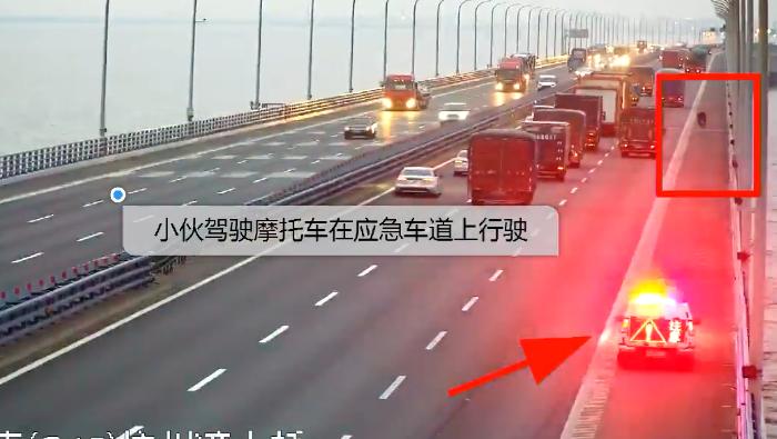4月21日18时,高速交警宁波支队五大队监控中心发现有一辆摩托车上了杭州湾跨海大桥,监控中心立即下达指令让前方执勤交警前往处置。