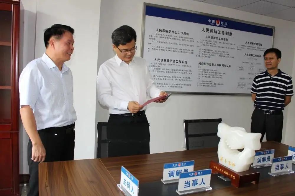 随后,肖胜方一行走访了广东刚毅律师事务所,通过察看该所党建活动场所、听取党支部书记汇报等形式了解该所的党建工作情况,并详细了解云浮石头人调解工作室的运行机制和作用发挥等情况。