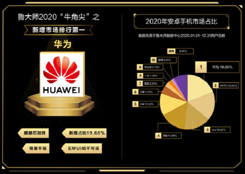 根据知名测评平台鲁大师公布2020年安卓手机新增市场占比图显示,三星在过去一年中,新增市场占比达到4.75%,击败魅族、一加等国产小众品牌,位列中国第六。