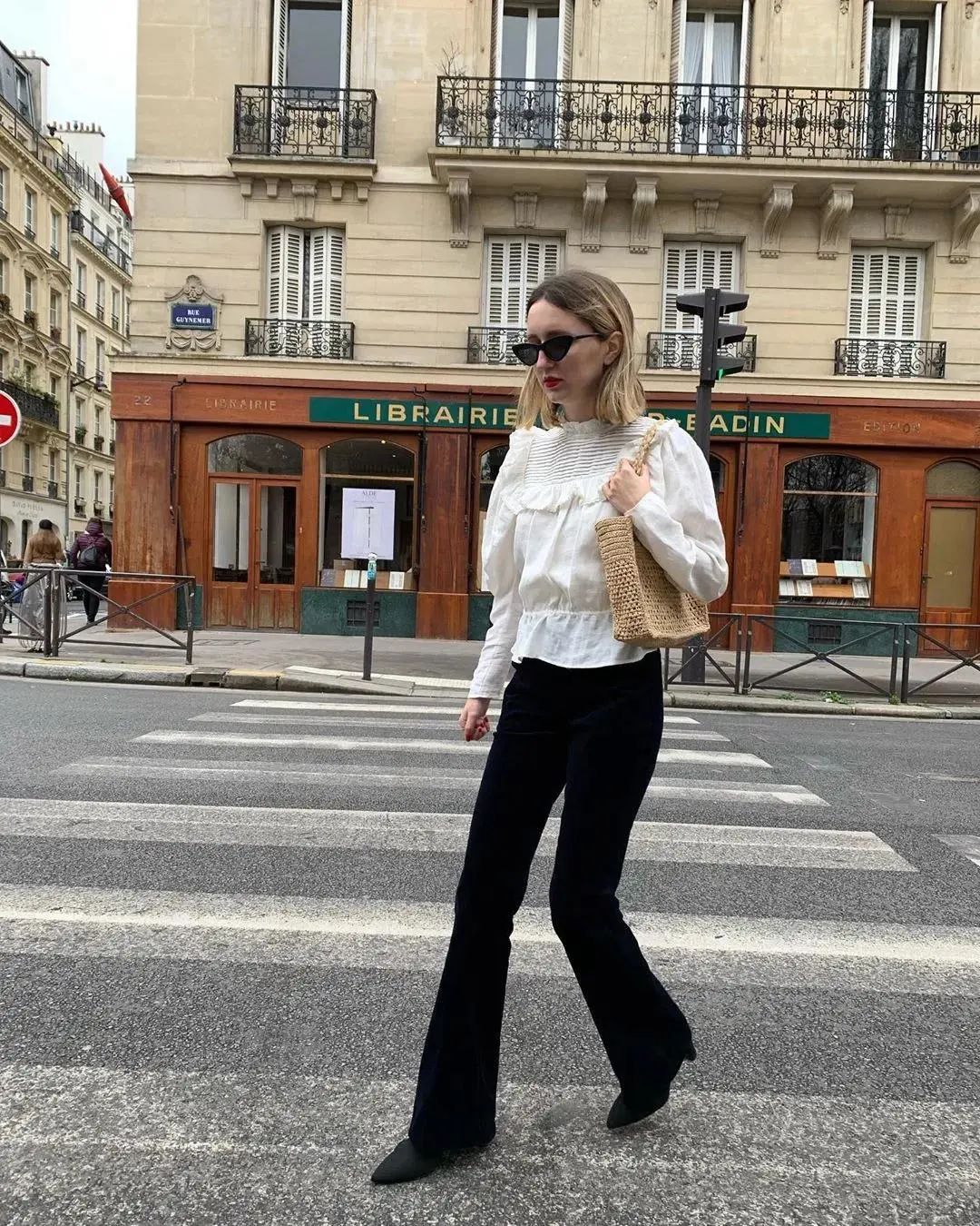 当宫廷风花边衬衫遇上喇叭裤,一身穿搭复古气质十足,还带着法式浪漫气息。