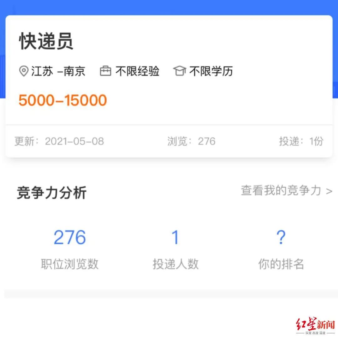 红星资本局梳理发现,在一个临时工招聘平台,位于南京的一家供应链公司招聘快递员,开出的薪酬是5000-15000元,并不算低,但在线投递人数仅1人。同样,位于北京的一家物流公司招聘快递员,薪酬5000-15000元,浏览数近300,投递人数也仅1人。