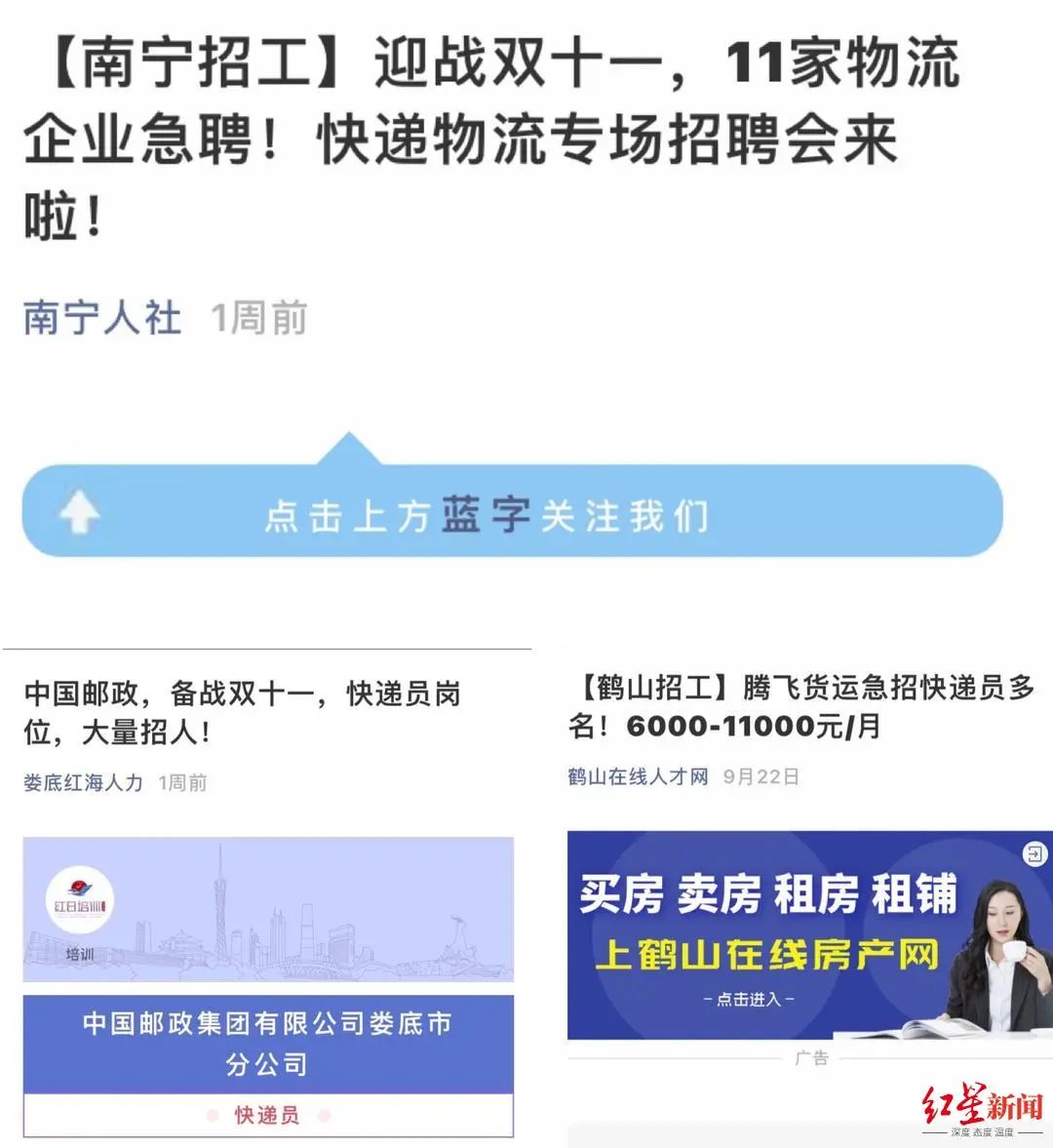 “备战双十一,大量招人”;“急招快递员,6000-11000元/月”……“高薪”“日结”“临时工”成为快递企业招聘高频词。