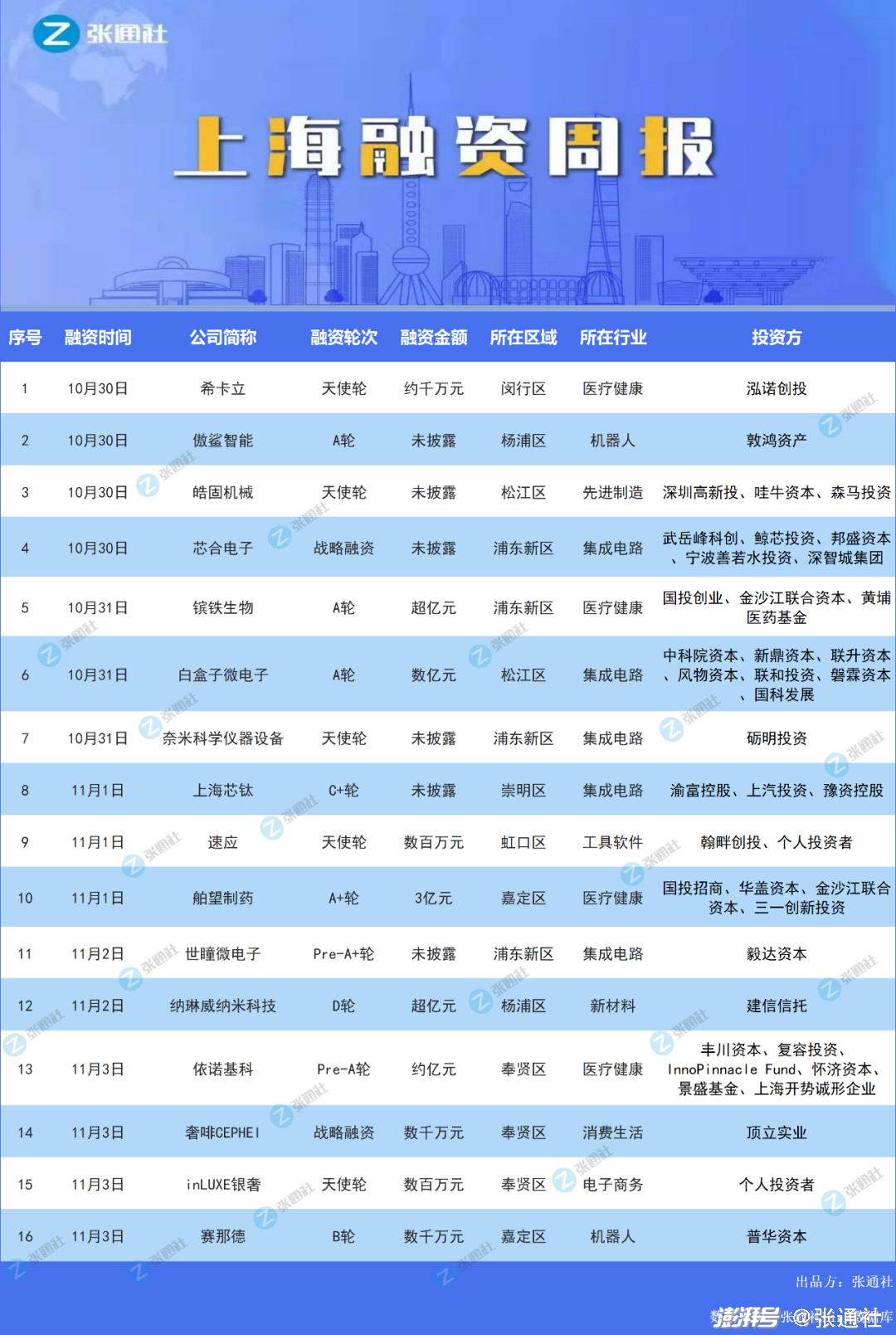 根据张通社Link数据库统计,本周 (10.30-11.5),上海发生16起融资事件,合计融资金额超10亿元。除去未披露的,融资金额达亿元和约亿元人民币的有5起。