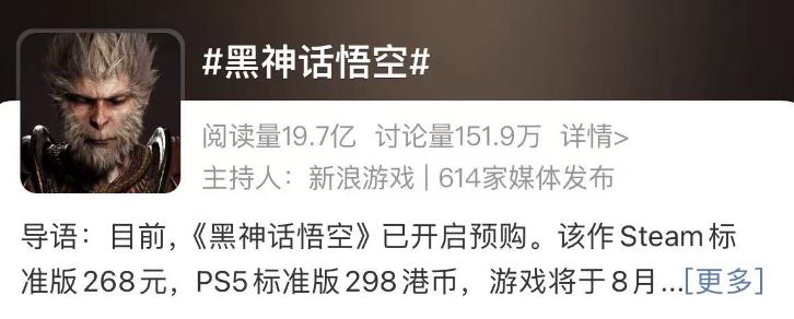 从昨天上午开始,国产游戏《黑神话:悟空》就持续霸屏热搜,阅读量高达19.7亿!