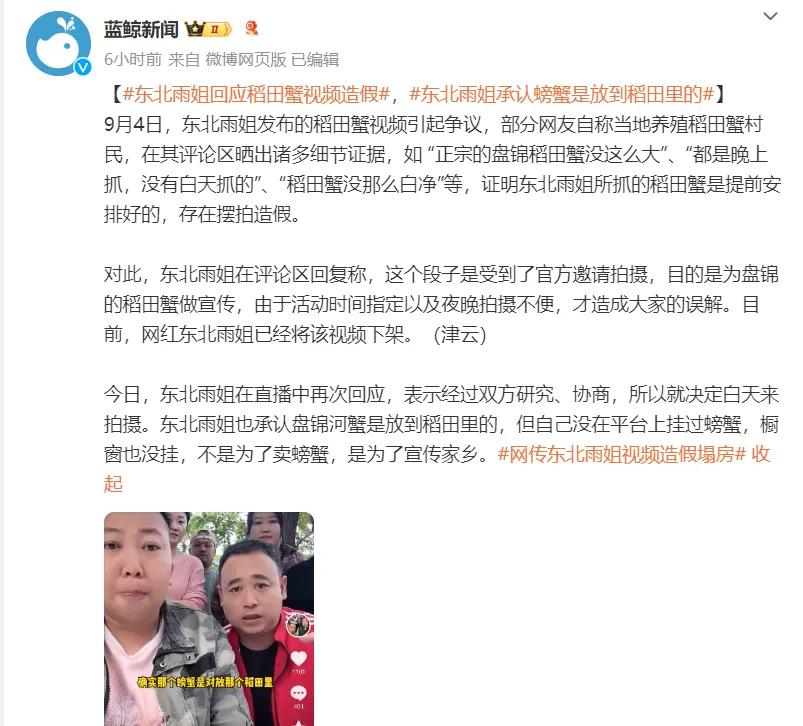 从雨姐关于此前稻田蟹事件的回应来看确实如此。雨姐第一次回应稻田蟹事件是在评论区,她简单解释称是受官方邀请拍摄,由于活动时间指定以及夜晚拍摄不便才造成大家的误解。随后其又在直播中再次回应并承认盘锦河蟹是放到稻田里的。