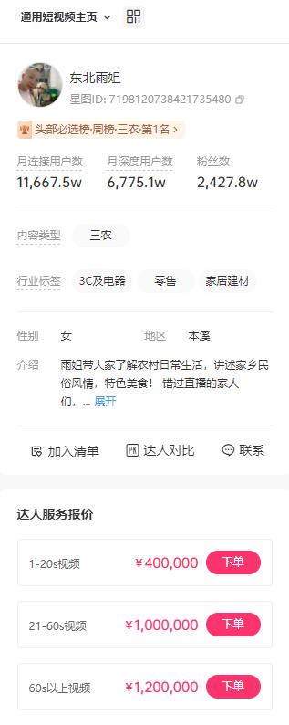 巨量星图显示,东北雨姐21-60秒的短视频报价100万,60秒以上视频报价120万,名列头部必选榜三农周榜/月榜的第1名。6月以来,东北雨姐共发布了3条星图视频,涉及电商平台、电动车、脱毛仪等。