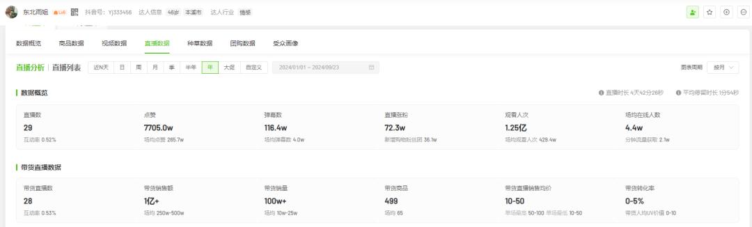 虽是短视频博主出身,直播却是雨姐目前变现的主要渠道。飞瓜数据显示,2024年以来雨姐共直播带货28场,累计带货销售额超1亿。雨姐带货产品以食品饮料和生鲜产品为主,直播场均观看人次超400余万。