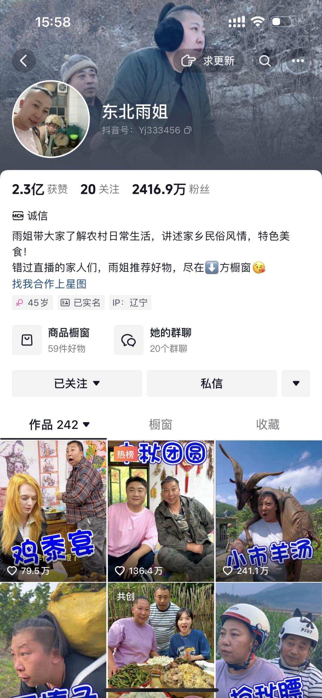 东北雨姐在抖音拥有超过2400万粉丝,是名副其实的知名网红。她因为视频中利落的干活风格、贴近现实的农村日常而走红,最热的视频收获超400余万点赞。