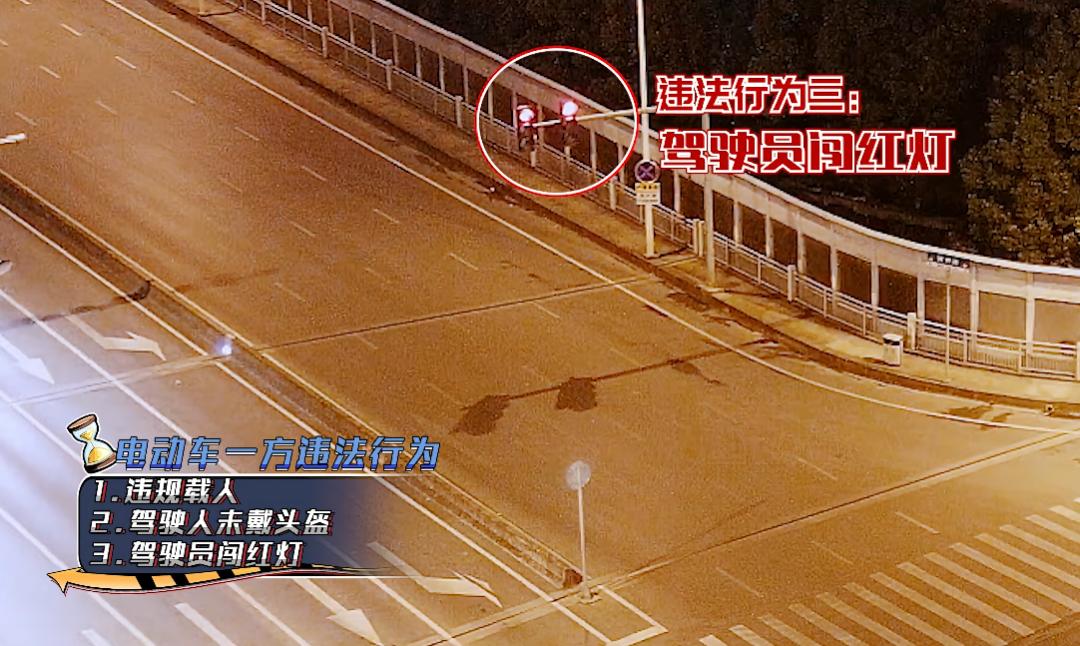 因为两个大学生也存在违法行为,违规载人、未戴头盔,以及,闯红灯。