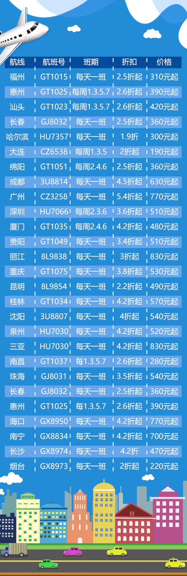 (注:以上价格均不含机场建设费,机票价格随时变动,具体价格以购买时为准!售票咨询电话:0516-85697999)
