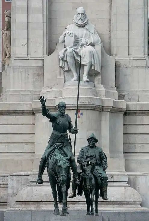 据说雕像特意复制马德里市西班牙广场的塞万提斯石像,但经对比,二者并不太一样:马德里市的石像为坐像,左手也无剑可抚;相同的是右手都拿着书稿。
