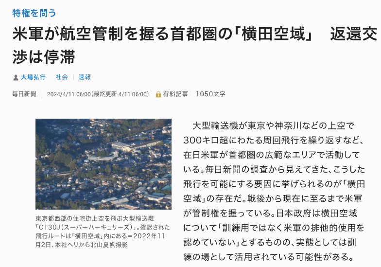 所谓“横田空域,”是指横跨东京都西部、伊豆半岛、长野县、新潟县,高度三千七百米至七千米的一片由美军管制的巨大空域。该空域内设有驻日美军的横田空军基地,任何经过该空域的飞行器都需要事先获得美军的允许。与之相对,美军在这片空域中则享受绝对意义上的自由,甚至理论上可以自行采取任何形式的军事演习或行动,完全不必知会日本政府。因此,从成田或羽田起降的客机,才不得不避开这片空域,只能绕行。