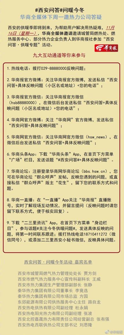 ▲11月15日是供暖第一天,华商报接到不少读者投诉,西安大兴新区片区多小区暖气不热…今天(11月16日),华商全媒体邀请邀请城管局燃热处、燃热服务中心、部分热力企业负责人到华商报社参加“西安问答·问暖今冬”活动,解答市民供暖难题。从上午9时到11时,随时提出你家的用热问题,现场嘉宾在线答疑解惑。九大互动通道等你来参与~ 详戳↓↓