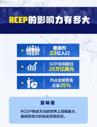 热点资讯▲第四次区域全面经济伙伴关系协定领导人会议11月15日举行,历经8年谈判,东盟十国以及中国、日本、韩国、澳大利亚、新西兰15个国家,正式签署区域全面经济伙伴关系协定(RCEP),标志着全球规模最大的自由贸易协定正式达成。