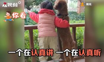 ▲萌娃与狗狗之间竟然能“跨物种交流”?近日,一段视频中萌娃与泰迪狗一起踮起脚尖站在栏杆边,一个认真讲,一个认真听,萌娃还用手轻轻搂住狗狗,画面温馨又有爱。网友:好和谐的画面,超暖!