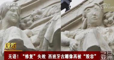 ▲近日,西班牙出现一起令人哭笑不得的雕像“修复失败”事件。一栋银行建筑外的古雕像头部有些损坏,修复师将其修复后,雕像变得面目全非。这已不是西班牙第一次发生类似事件。2012年,在西班牙博尔哈镇, 一副因年代久远剥落严重的壁画,也因“修复毁容”,受到了广泛批评。