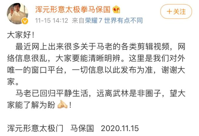 11月15日,自称“浑元形意太极拳掌门人”马保国,微博发文回应其视频遭各类恶搞剪辑:网络信息很乱,希望大家清晰明辨。马老已回归平静生活,远离武林是非圈子。