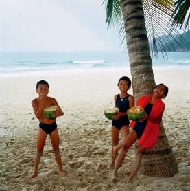 照片里的小朋友们或是在街头调皮地玩耍玩具、或是端正地坐在椅子上写作业;在夏天捧着椰子大笑,在冬天穿着大棉袄站在家门口……