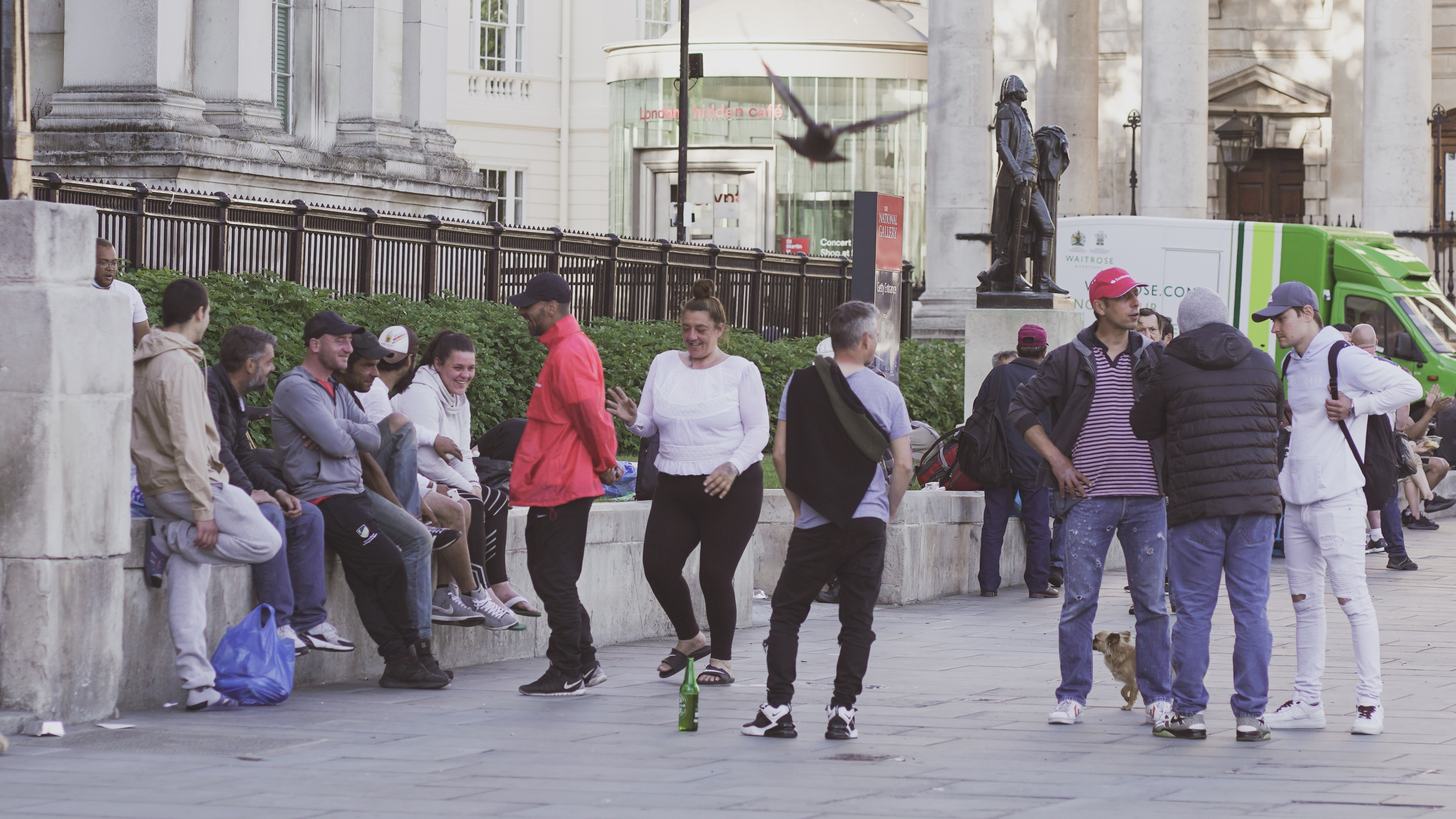 3月24日,伦敦城因新冠疫情封城,大批餐饮、酒店行业从业者因失业无法支付房租后流落街头。伦敦市中心西敏市(City of Westminster)以特拉法加广场为中心,慈善组织与教堂设置了一批救济粮发放点,每天白天都有一百余名流浪汉聚集于这些发粮点,等待领取粮食,夜间则各自散入西敏市休息。后来,有人开始将发粮点称为“鸽子笼”——发粮时常有大批鸽子为拾救济粮的残渣而飞入。