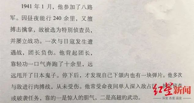 尤其是在一次与日寇发生的遭遇战当中,团长受伤,马德峰背起了团长,依靠轻功的绝学,一口气背着团长跑了十余里。”