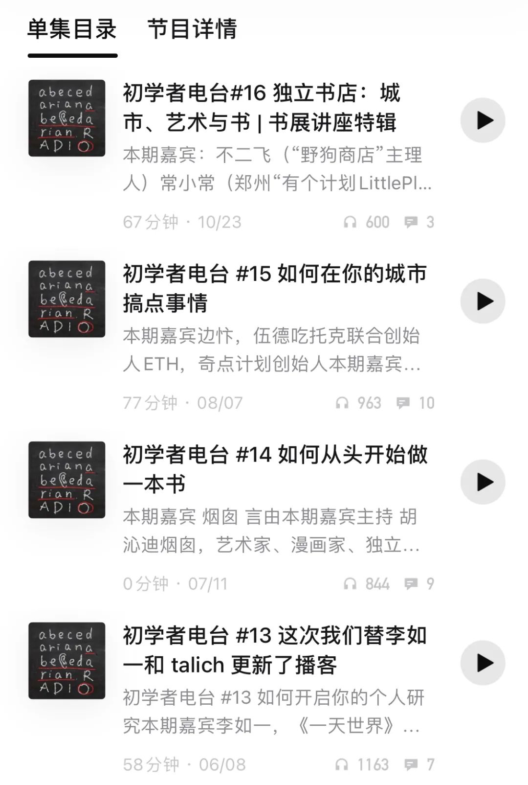 z= 选题一般都是大家各自报感兴趣的题目,然后再细化。也有个别节目是先定下播客的嘉宾,再一起讨论主题。我们目前后台可以看到的高收听率/完听率的节目有乐队巡演、独立书店、个人研究等,包括疫情期间的两期特别节目“直播能拯救焦虑的艺术界吗”和“直播卖书挣到钱了(吗)”也收到很多朋友的反馈(大家比较感同身受吧)。另外,因为我们上传了好几个平台,不同平台间受欢迎的题目也有一些差异,挺有趣的。