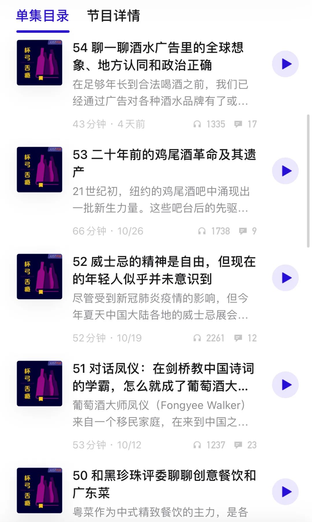 s= 《杯弓舌瘾》是一档围绕酒类话题的播客节目,由我和 Ian 戴鸿靖主持。通常会邀请 1-2 位嘉宾进行对谈,嘉宾大多数也是酒行业的从业者,还有一些是跨界嘉宾。