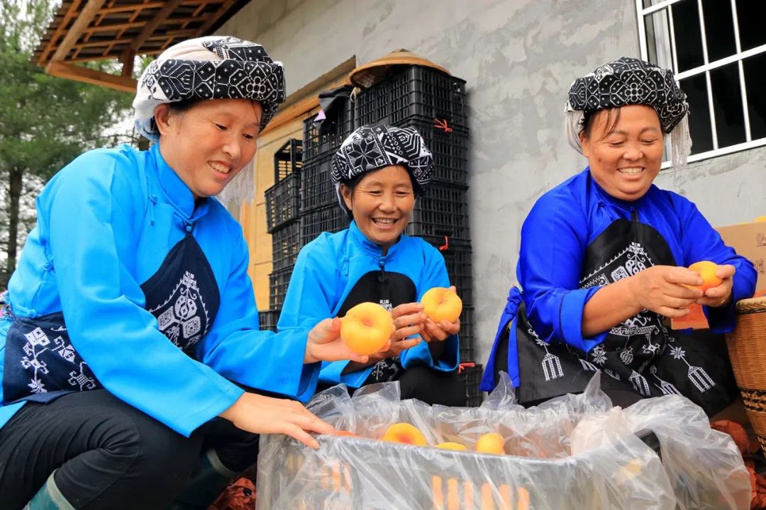 桃林硕果累累,桃树枝头色泽诱人的果实随风散发出阵阵芬芳,在湖南省泸溪县洗溪镇达力寨村百亩桃林基地上,中冶长天驻村扶贫工作队员正与身着苗服、头巾,携带背篓的村民们,趁着雨后放晴天气,穿梭于百亩桃林间,抢抓农时采收蟠桃“扶贫果”。