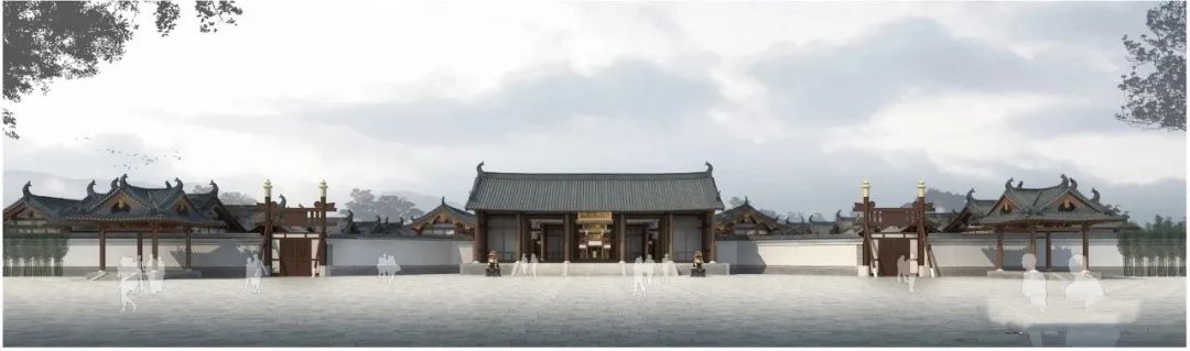 ▲瑞州府衙大门(效果图)大门为单檐悬山建筑,面阔五间,进深两间。通面阔21.42m,通进深7.56m。